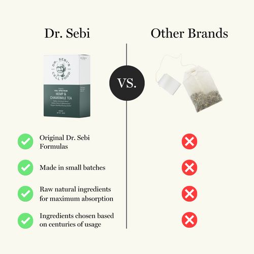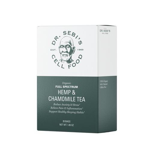 Dr. Sebi's Cell Food Hemp & Chamomile Tea supports serenity and sleep. The combination of Full Spectrum Hemp with Chamomile provides revitalizing plant compounds that induce deep relaxation and support immune rejuvenation while pain-relieving anti-inflammatories alleviate discomfort and decrease oxidative stress.