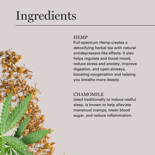 Full-spectrum Hemp creates a detoxifying herbal tea with natural antidepressant-like effects. It also helps regulate and boost mood, reduce stress and anxiety, improve digestion, and open airways, boosting oxygenation and helping you breathe more deeply. Chamomile, used traditionally to induce restful sleep, is known to help alleviate menstrual cramps, lower blood sugar, and reduce inflammation. The naturally sedating herb promotes rhythmical and REM sleep, helping you wake feeling refreshed. Our full-spectrum Hemp is ISO-certified and contains less than 0.3% THC, allowing your body to relax and your mind to unwind without impacting mental clarity.